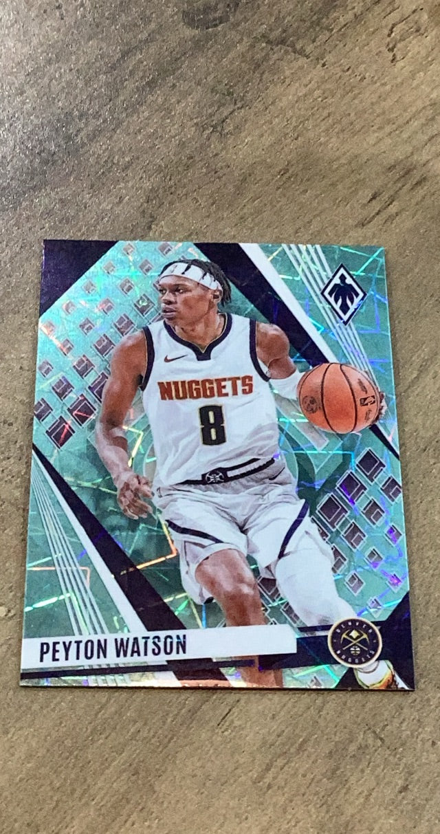 This 2023-24 Panini Phoenix Teal Lazer parallel card of Peyton Watson is a vibrant collectible for Denver Nuggets fans, showcasing a rising two-way talent!