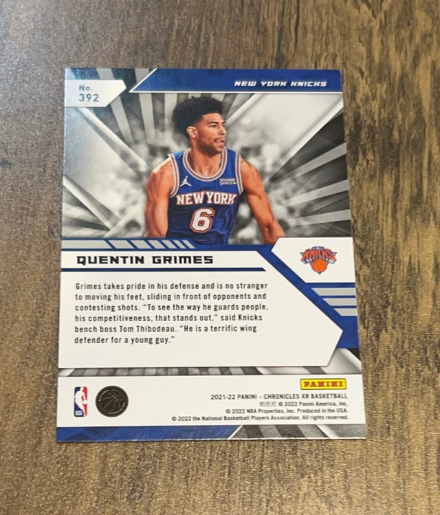This 2021-22 Panini Chronicles XR rookie card of Quentin Grimes is a vibrant collectible for Knicks fans, featuring a rising star in near mint condition. Ideal for NBA collectors!