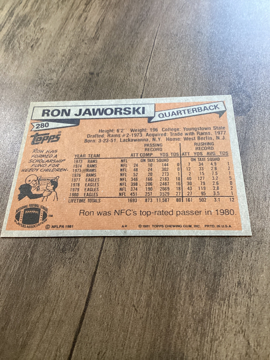 This 1981 Topps card of Ron Jaworski is a classic for Philadelphia Eagles collectors!
