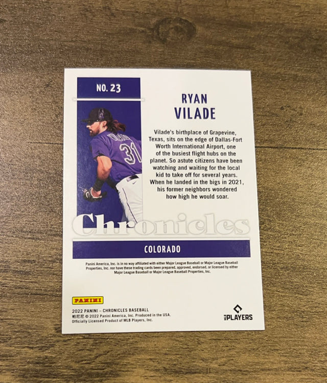 This 2022 Panini Chronicles rookie card of Ryan Vilade is a vibrant collectible for Rockies fans, showcasing a dynamic outfielder!