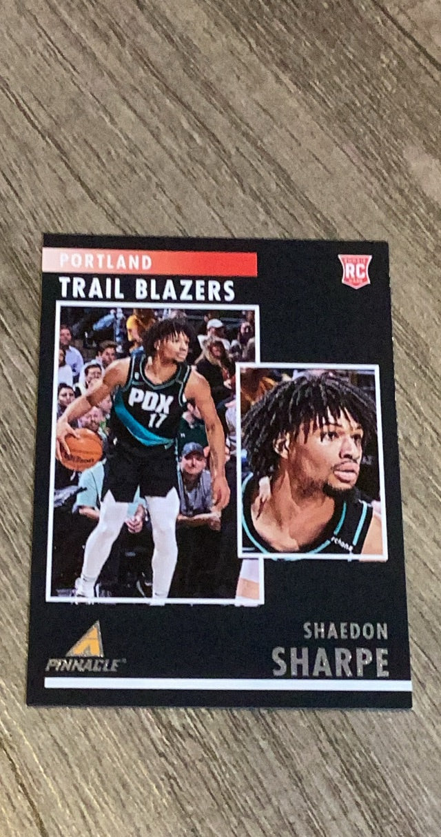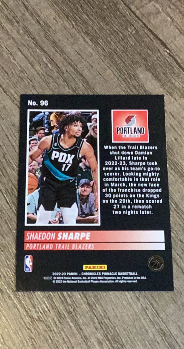 This 2022-23 Panini Chronicles Pinnacle rookie card of Shaedon Sharpe is a vibrant collectible for Portland Trail Blazers fans, showcasing a high-flying guard with star potential!