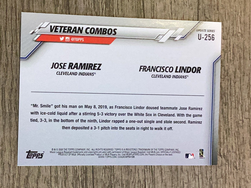 Introducing the Shower Time card featuring Jose Ramirez and Francisco Lindor from the Cleveland Indians. This collectible card is part of the 2020 Topps Update series, specifically U-256.