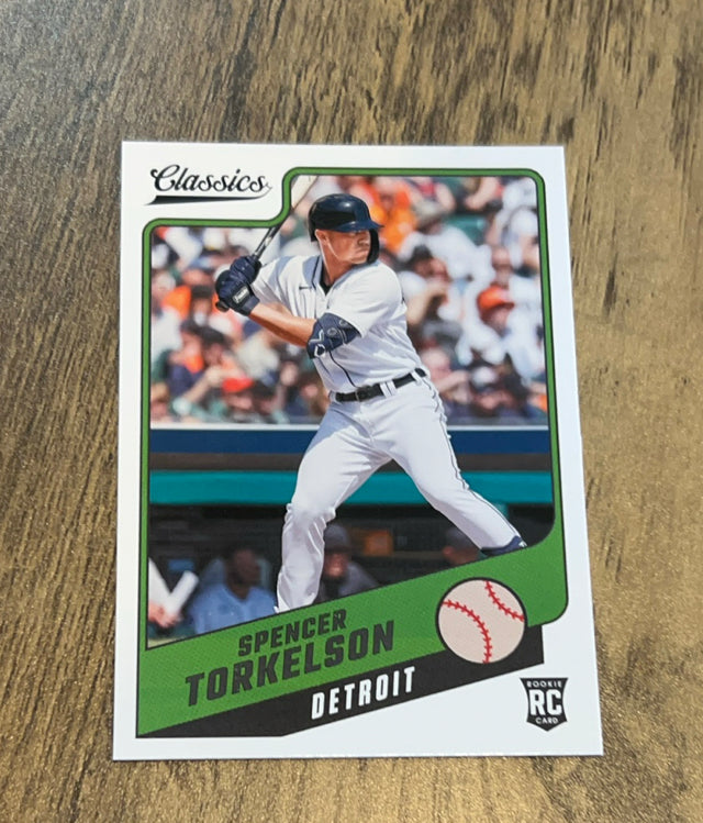 This 2022 Panini Chronicles Classics rookie card of Spencer Torkelson is a vibrant collectible for Tigers fans, showcasing a top prospect!