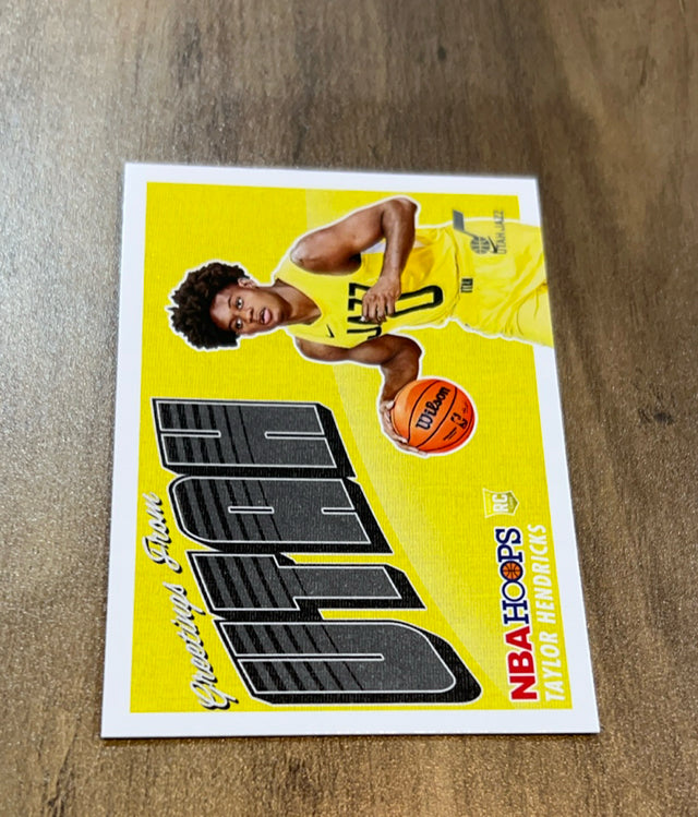 This 2023-24 Panini Hoops Rookie Greetings insert card of Taylor Hendricks is a premium collectible for Utah Jazz fans, showcasing a promising young forward with defensive upside!