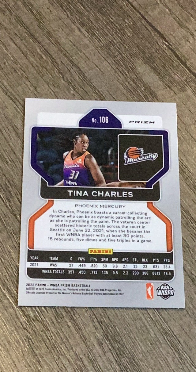 This 2022 Panini Prizm WNBA Green card of Tina Charles is a premium collectible for Phoenix Mercury fans, showcasing an 8x WNBA All-Star!