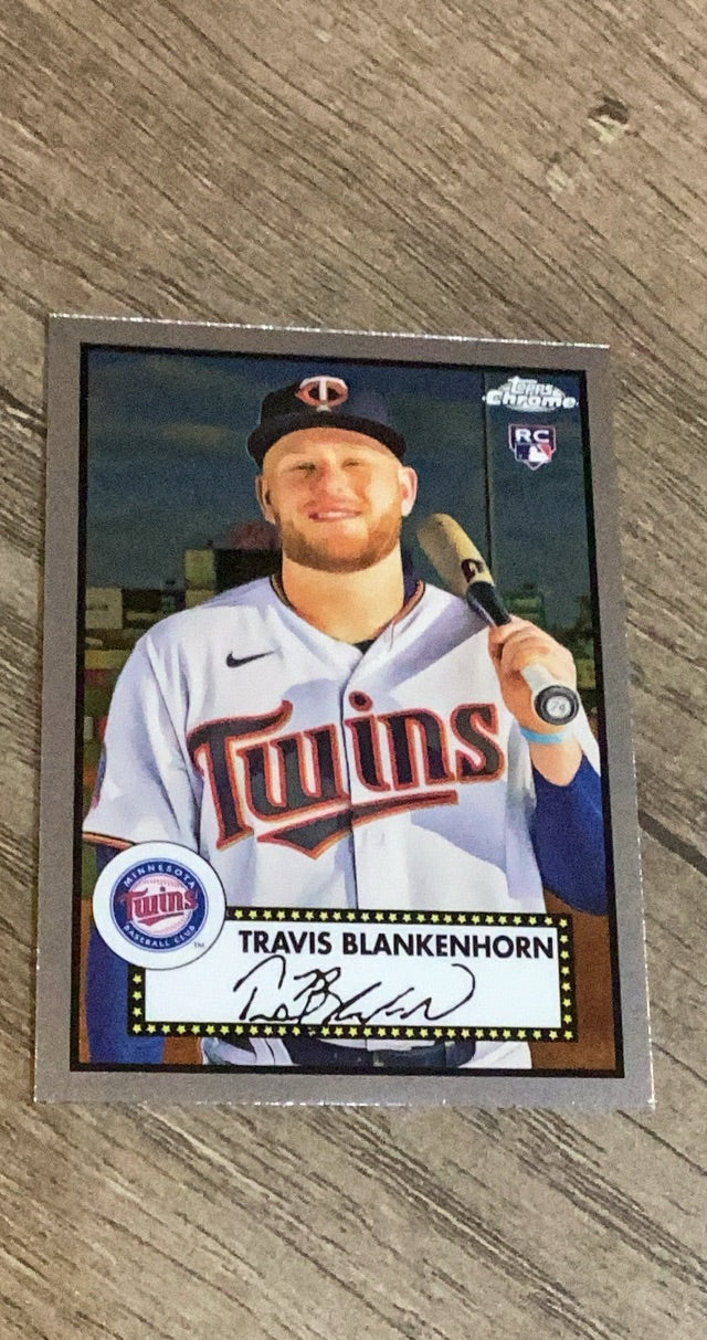 This 2021 Topps Chrome Platinum Anniversary rookie card of Travis Blankenhorn is a vibrant collectible for Twins fans, showcasing a young infielder in new condition. Perfect for MLB collectors!