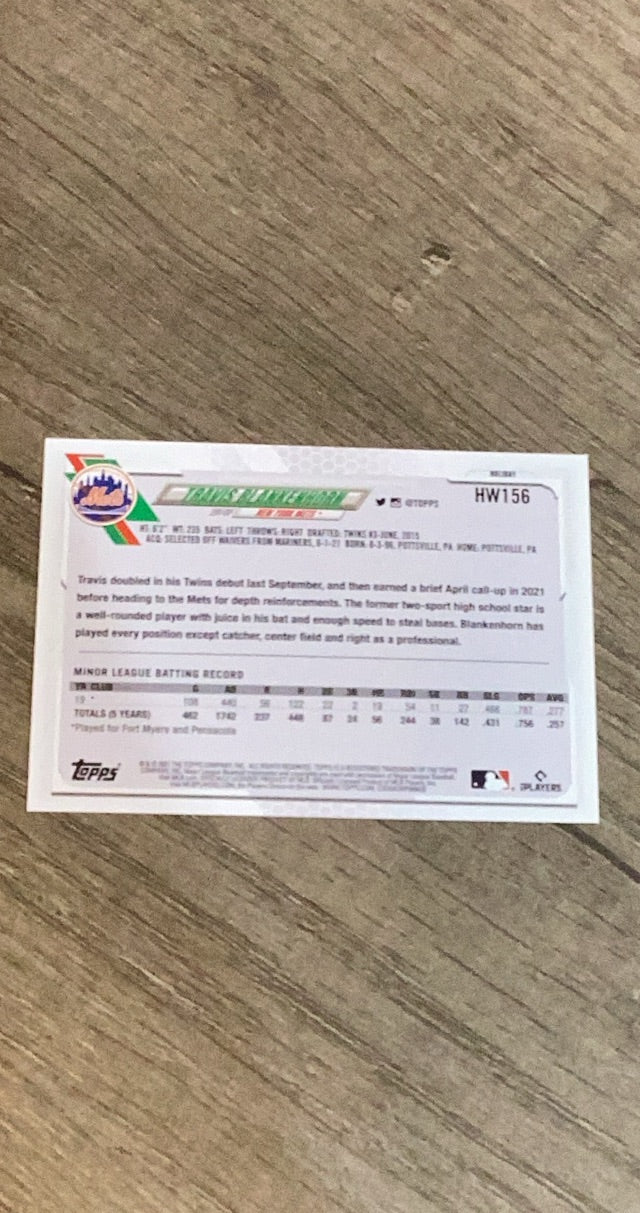 This 2021 Topps Holiday rookie card of Travis Blankenhorn is a vibrant collectible for Mets fans, showcasing a young infielder in new condition. Ideal for MLB collectors!