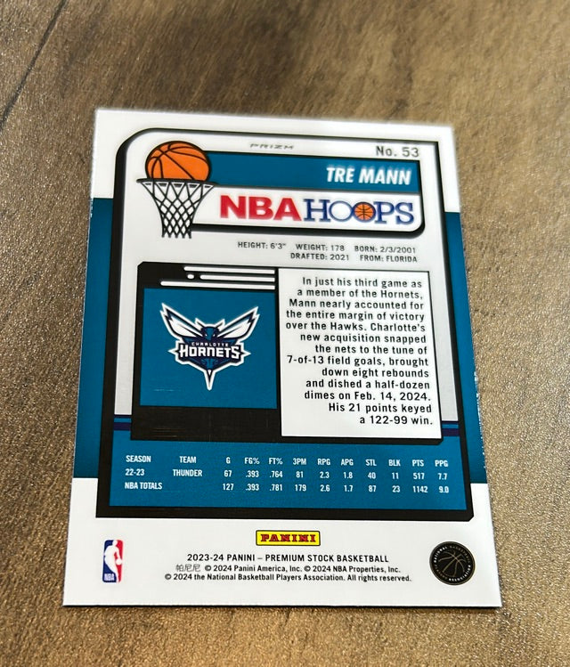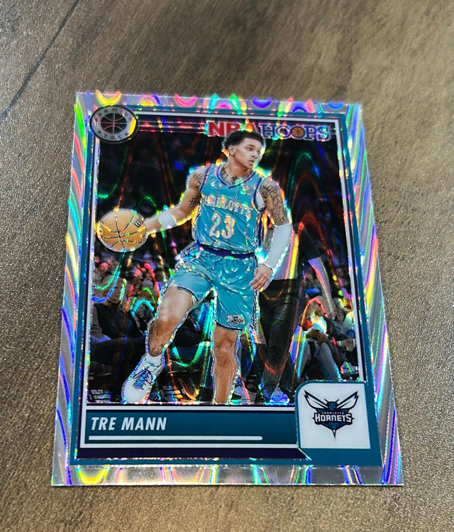 This 2023-24 Hoops Premium Stock Multi Wave Prizm rookie card of Tre Mann is a vibrant collectible for Hornets fans, featuring a stunning parallel in near mint condition. Perfect for NBA collectors!