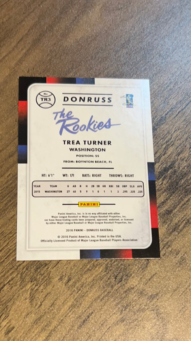 The Trea Turner Washington Nationals MLB 2016 Donruss - The Rookies TR3 is a must-have for any baseball card collector. This card showcases the promising talent of Trea Turner, a standout player for the Nationals.