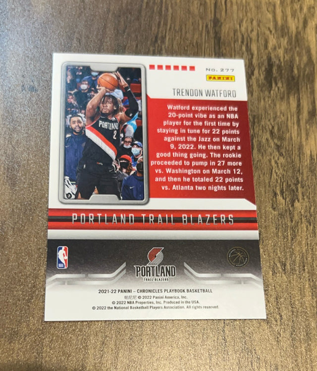 This 2021-22 Panini Chronicles Playbook rookie card of Trendon Watford is a vibrant collectible for Portland Trail Blazers fans, showcasing a versatile forward with potential!