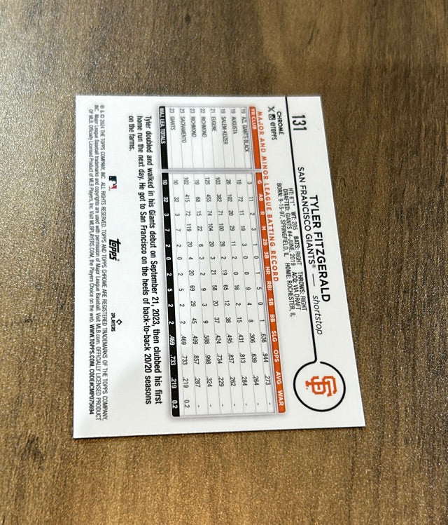 This 2024 Topps Chrome rookie card of Tyler Fitzgerald is a vibrant collectible for Giants fans, showcasing a young infielder in new condition. Perfect for MLB collectors!
