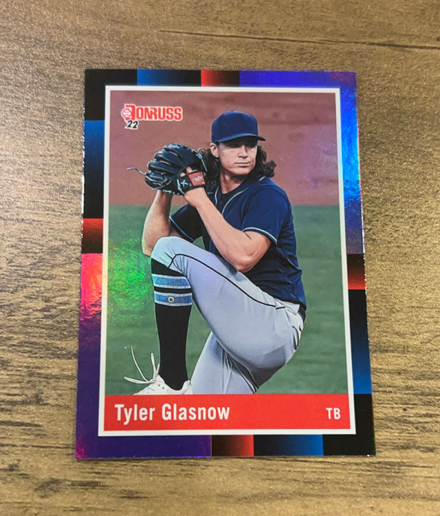 This 2022 Donruss Holo Purple parallel card of Tyler Glasnow is a vibrant collectible for Rays fans, showcasing a star pitcher!