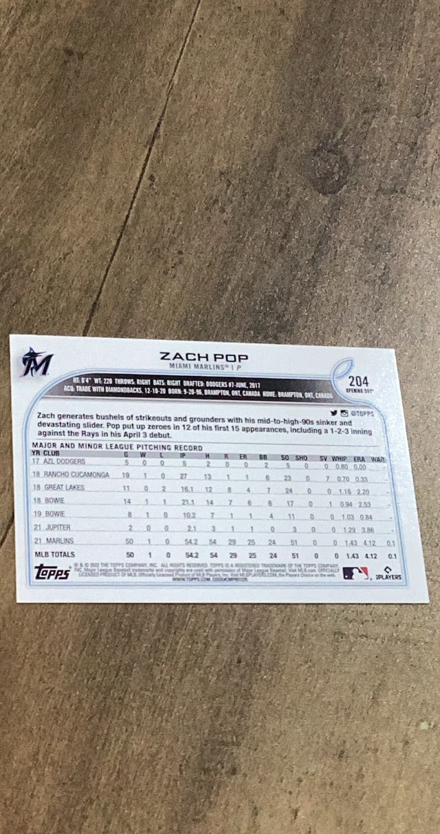 This 2022 Topps Opening Day rookie card of Zach Pop is a vibrant collectible for Marlins fans, showcasing a reliable reliever!