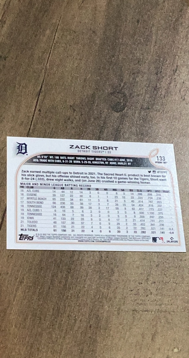 This 2022 Topps Opening Day rookie card of Zack Short is a vibrant collectible for Tigers fans, showcasing a versatile infielder!